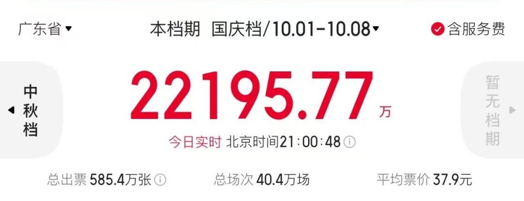 截至10月8日21时,2025年国庆档(10月1日—8日)总票房达18.3亿元。广东以超2.21亿元的档期票房成绩领跑,约占全国票房的12.1%,总观影人次超585万,总放映场次达40.4万,三项数据均居全国首位,稳居“第一票仓”。
