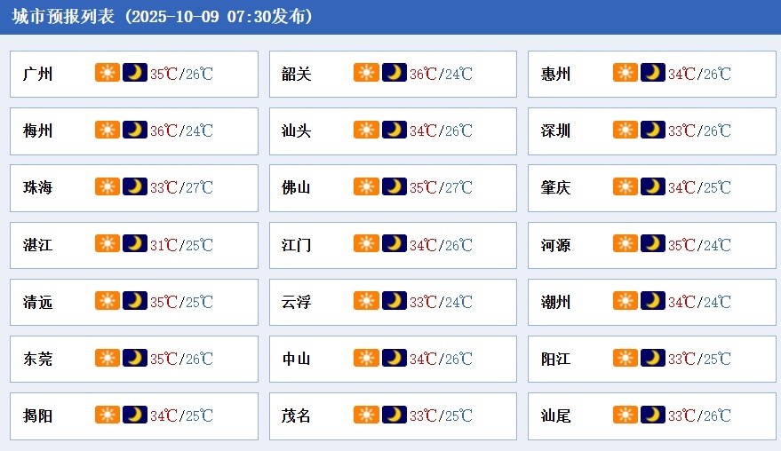 9日—11日,全省晴到多云为主,其中粤西多云间阴天有分散小雨。最高气温:粤西31~33℃,其余市县33~36℃,局部37℃。