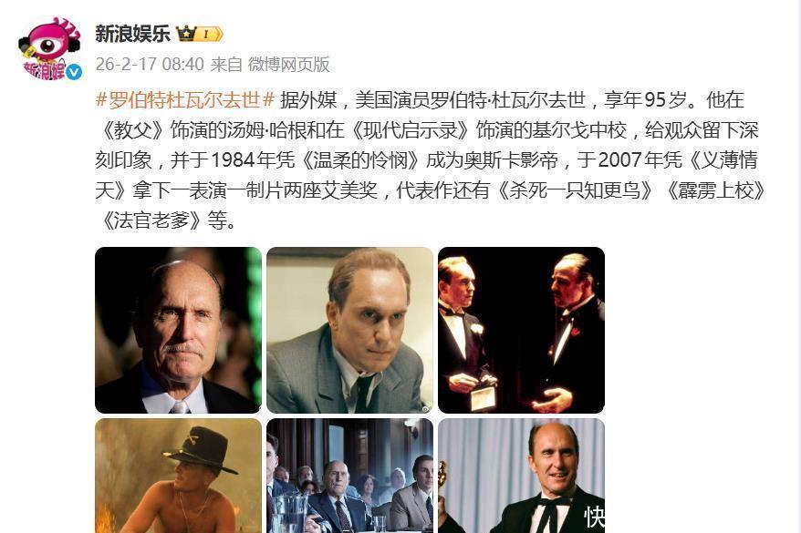 又一位定义时代的巨星,转身隐入了历史的帷幕。据2月17日报道,2月15日,奥斯卡影帝、好莱坞传奇演员罗伯特·杜瓦尔在弗吉尼亚州的家中安详离世,享年95岁。他的妻子卢西亚娜通过社交媒体发布讣告,证实这位表演巨匠“被爱意和安宁环绕”地平静离去。消息一出,全球影迷哀悼——那个由他参与塑造的、充满人性深度与戏剧张力的黄金时代股票配资平台个人代理,似乎也随之画上了一个沉重的句点。