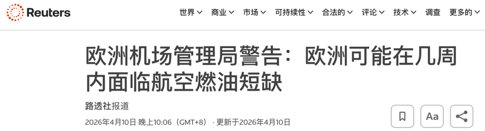 欧洲机场行业组织ACI Europe此前甚至警告,如果霍尔木兹海峡持续三周不能恢复,欧洲可能面临系统性航油短缺风险。
