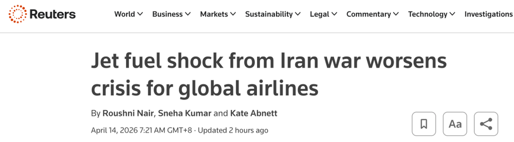 路透社4月13日援引行业数据和分析指出,自2月28日相关冲突升级以来,航空燃油价格已经出现倍增式上行,涨幅明显快于原油本身。