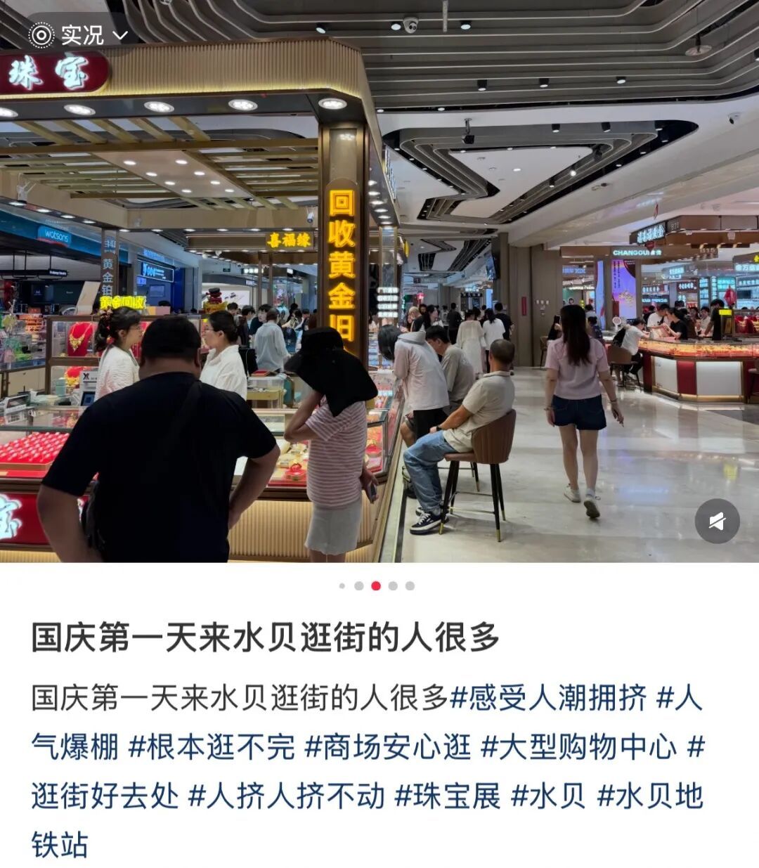 广东深圳水贝某黄金展厅客服经理 邓柳美:我们商场在国庆期间,人流量达到日均3万人次,同比增长10%左右,环比上个月基本上翻2到3倍。
