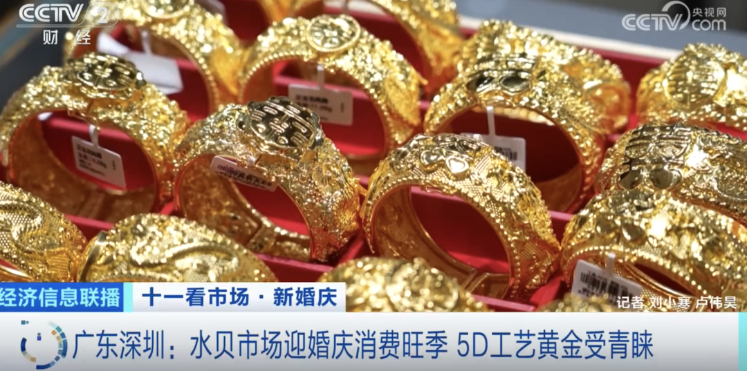 这个假期,水贝市场内的龙凤镯、喜字链、对戒等传统婚庆金饰依旧是销售主流,而随着金价持续攀升,5D工艺黄金凭借其轻量化、立体感的特色和时尚设计,正成为婚庆市场的新宠,尤其受到年轻消费者的青睐。
