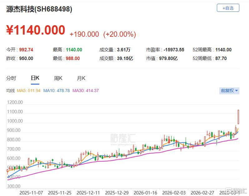 以2025年4月8日收盘价计算,源杰科技至今股价累计涨超1100%。