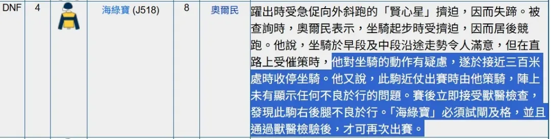 第二场赛事中,姚本辉马房的“海绿宝”由骑师奥尔民策骑,临场赔率为10倍。当赛程进行至直路最后300米时,该驹突然减速,随后骑师落马,现场观众见状纷纷推测马匹可能出现健康状况。而根据赛后官方报告,“海绿宝”右后腿出现行动异常,预计需休养一段时间后方能重返赛场。